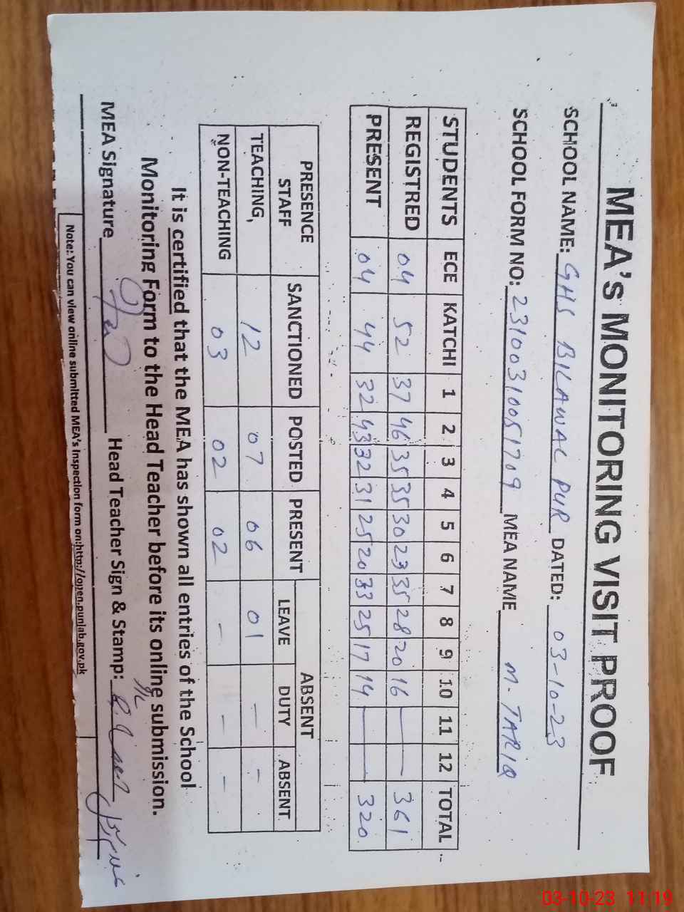| Attendance Register | Head Teacher | MEA with School | Visit Proof |