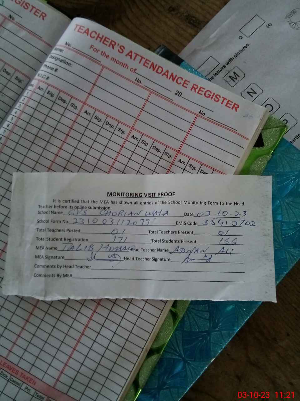 | Attendance Register | Head Teacher | MEA with School | Visit Proof |