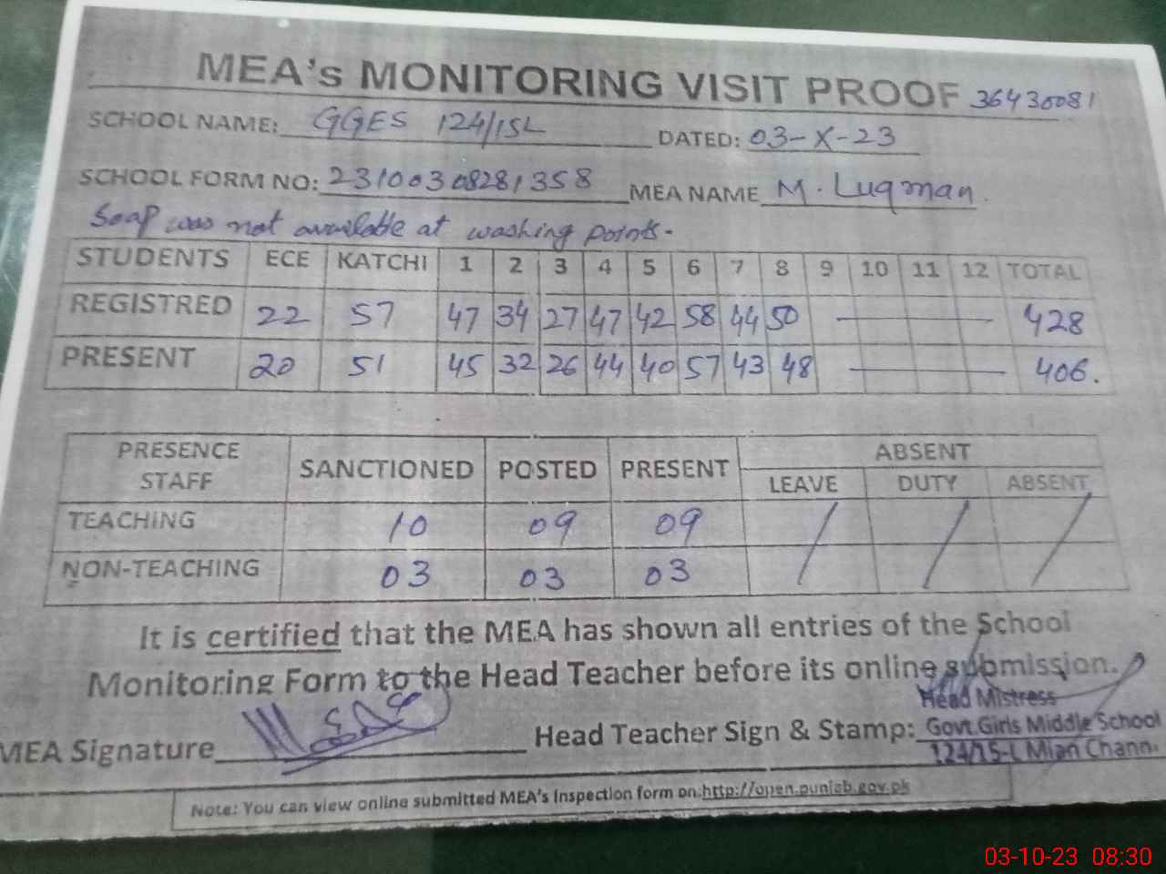 | EMIS Code: 36430081 | Name of School: GGES 124/15-L, MIAN CHANNU | |||