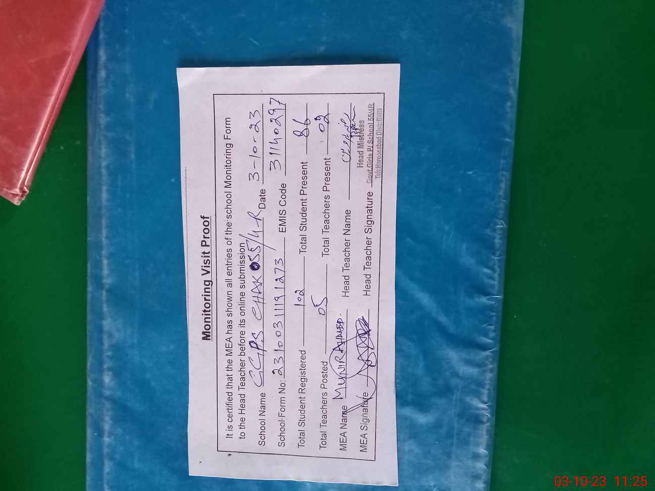 | Attendance Register | Head Teacher | MEA with School | Visit Proof |