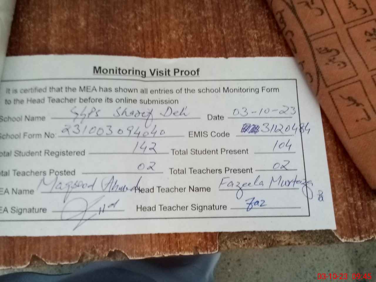 | Attendance Register | Head Teacher | MEA with School | Visit Proof |