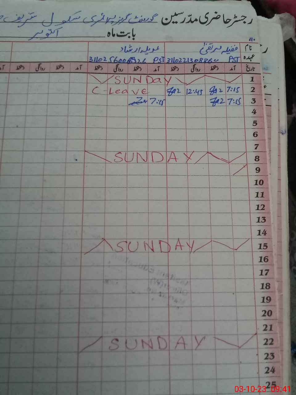 | CNIC | Full Name | Designation | R/C | Absence During Last Calender Month |