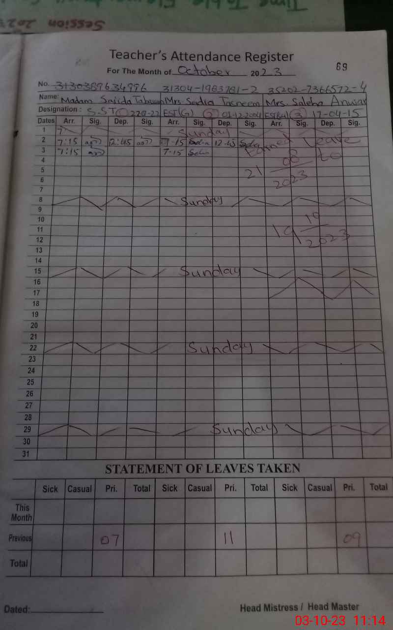 | Name: SA**** AN**** Designation: (School Headmaster's/Headmistress's) EST Phone/Cell Number: 03**** |