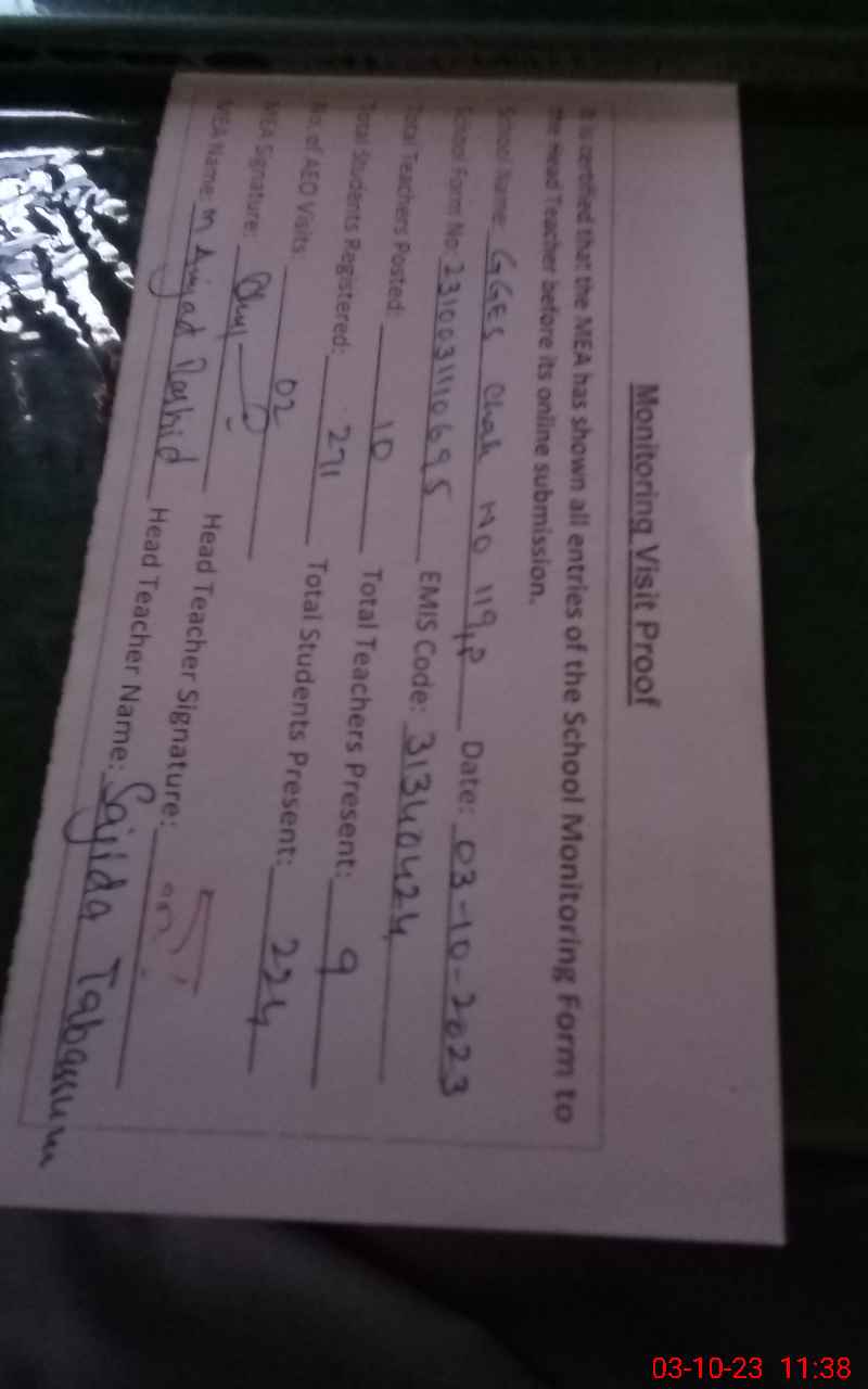 | Certified that this School was Inspected by the Undersigned MEA/DMO Today and the Information Stated Above is as Per Record. | |||||