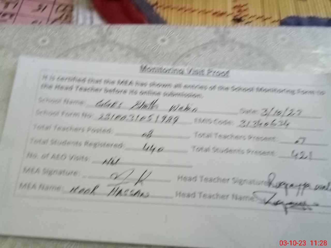 | Attendance Register | Head Teacher | MEA with School | Visit Proof |