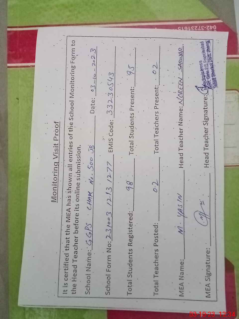 | EMIS Code: 33230543 | Name of School: GGPS CHAK NO 500 JB FRANCIS ABAD | |||