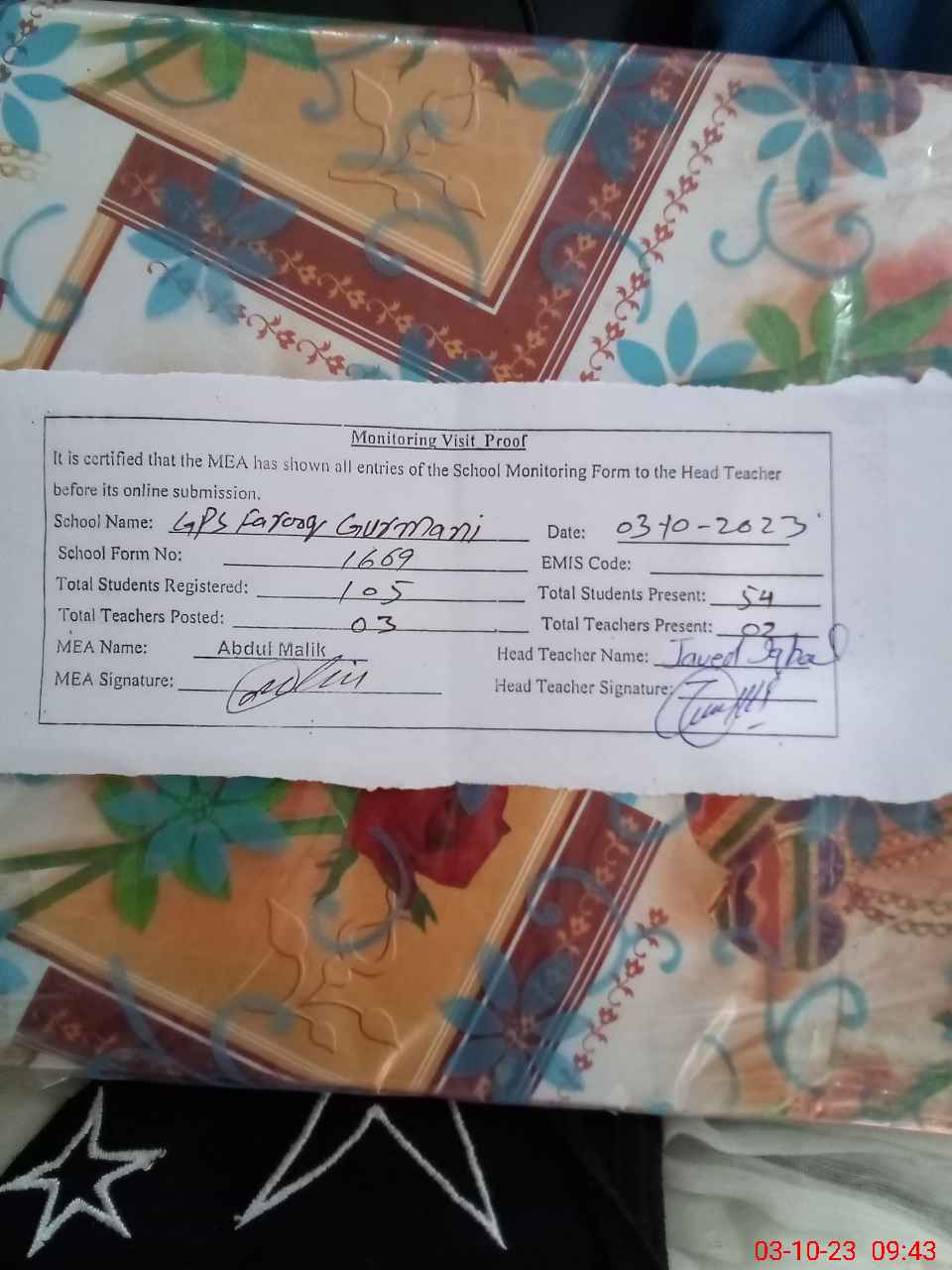 | EMIS Code: 32320111 | Name of School: GPS FAROOQ GURMANI | |||