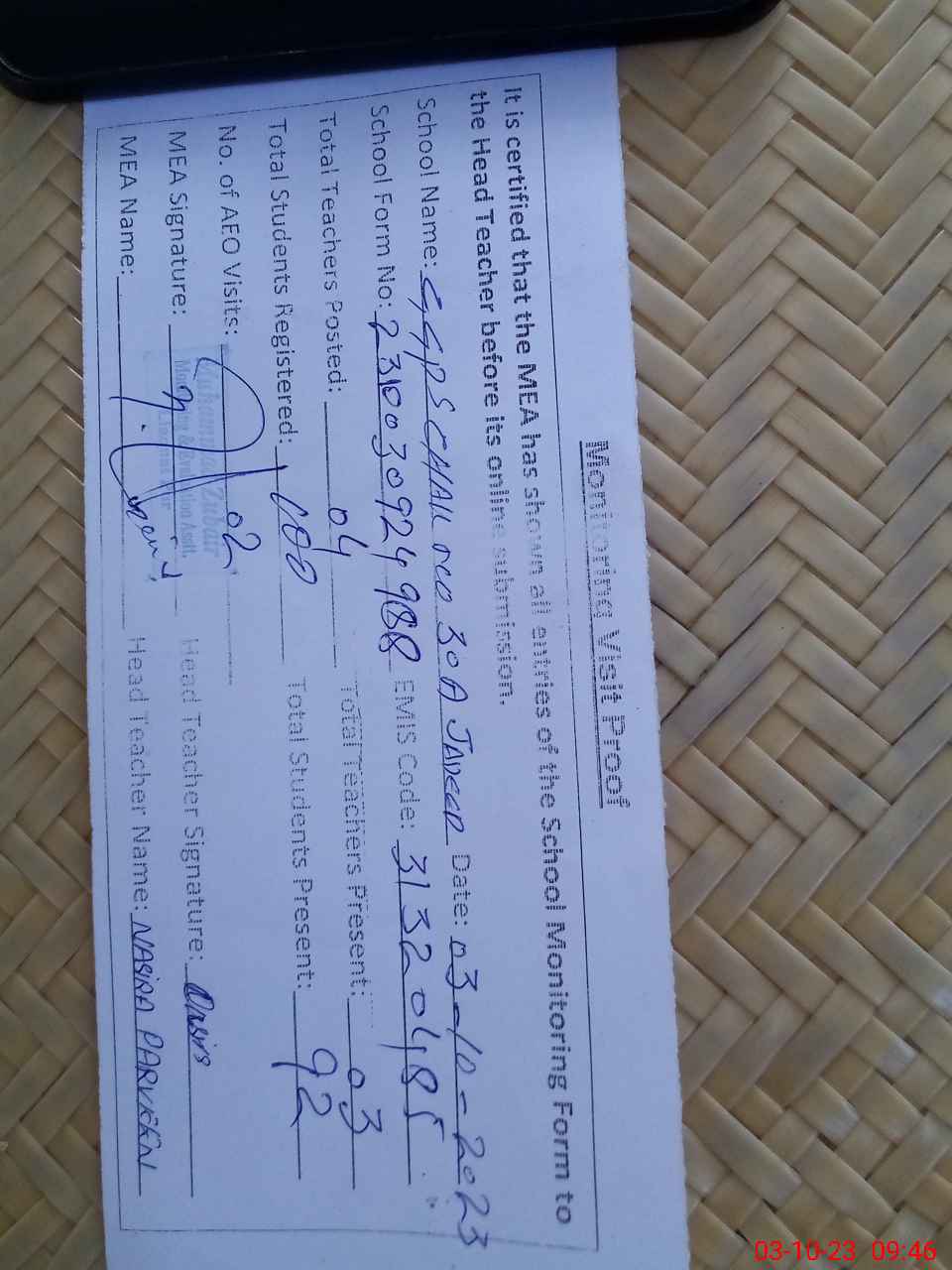 | Attendance Register | Head Teacher | MEA with School | Visit Proof |