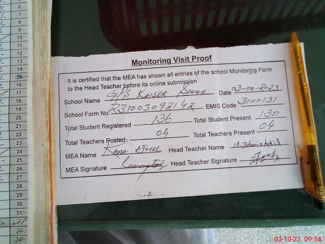 | EMIS Code: 31110131 | Name of School: GPS KASIR SINGH | |||