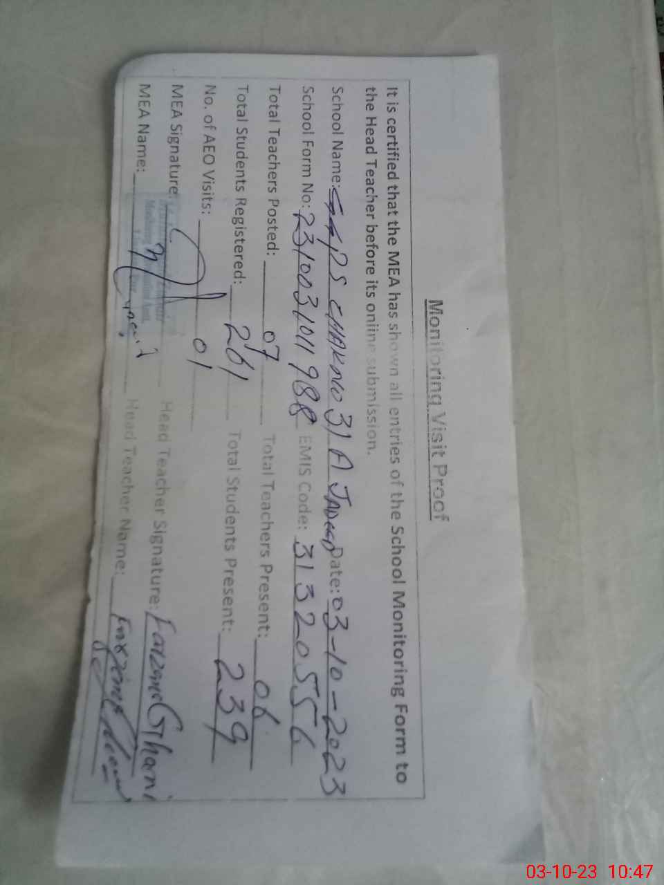 | Attendance Register | Head Teacher | MEA with School | Visit Proof |