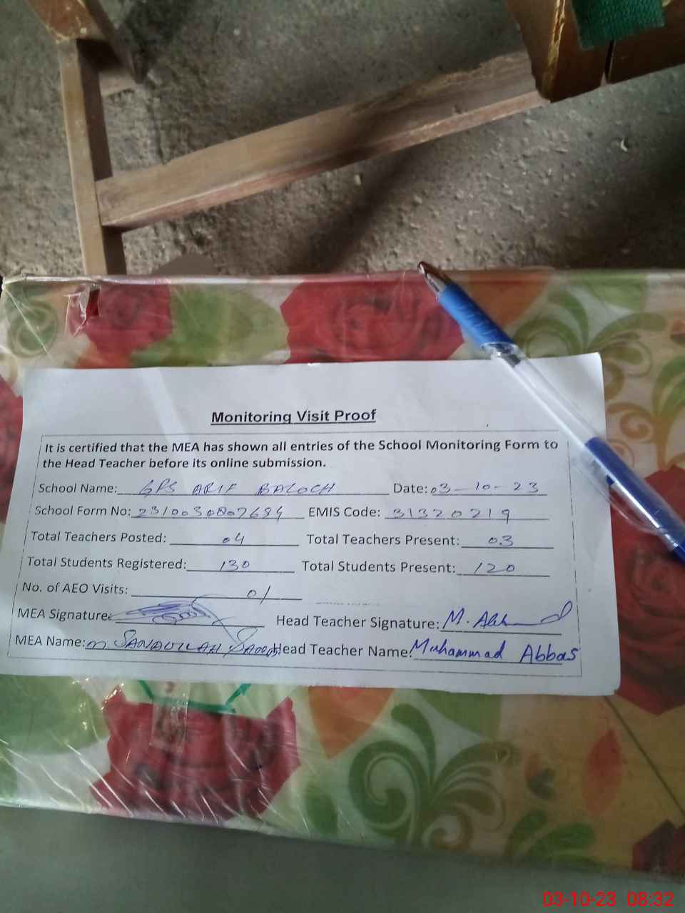 | EMIS Code: 31320219 | Name of School: GPS AARIF BLOCH | |||