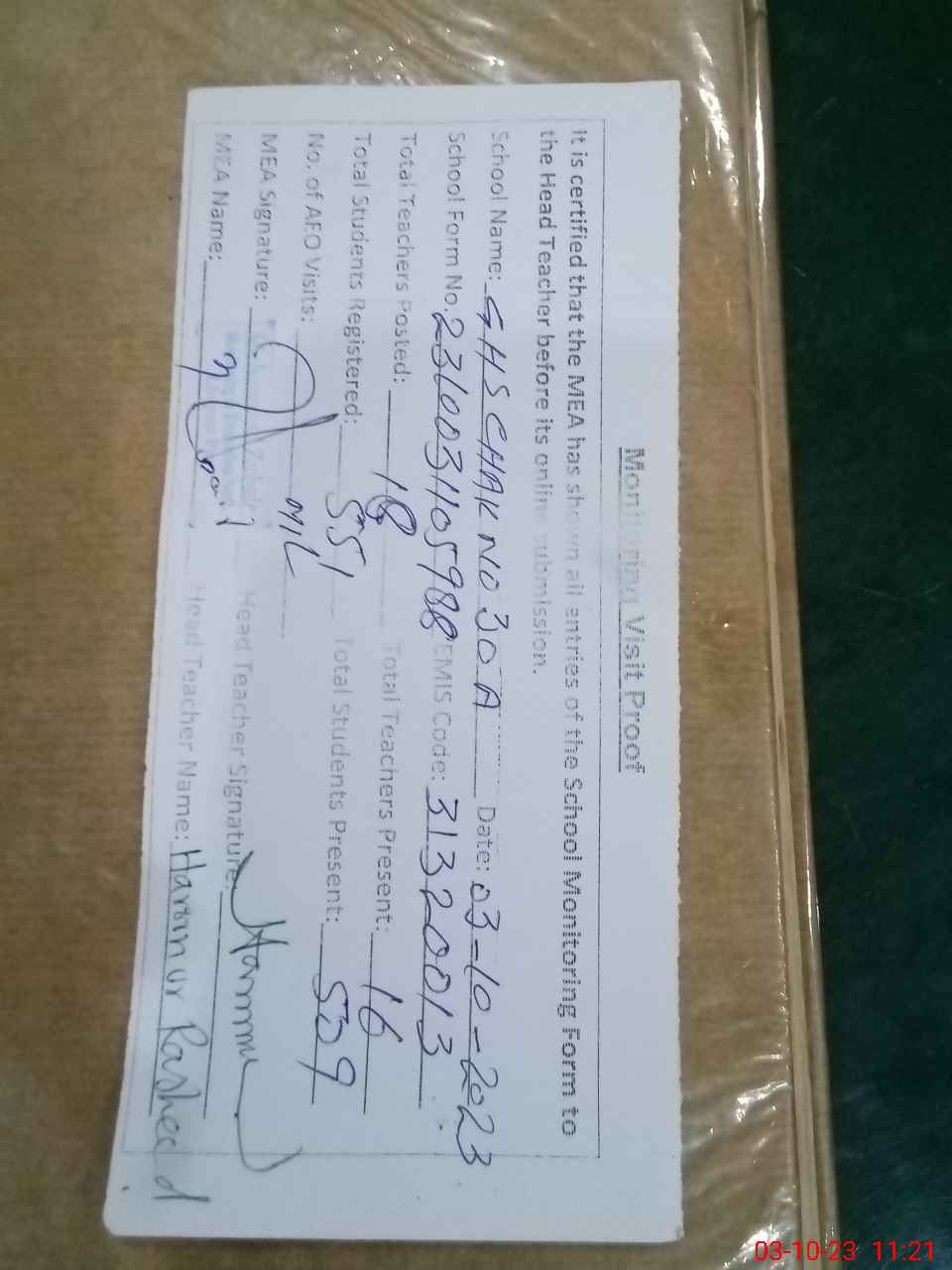 | Name: MU**** AR**** Designation: (School Headmaster's/Headmistress's) SST. ( I/C) Phone/Cell Number: 03**** |