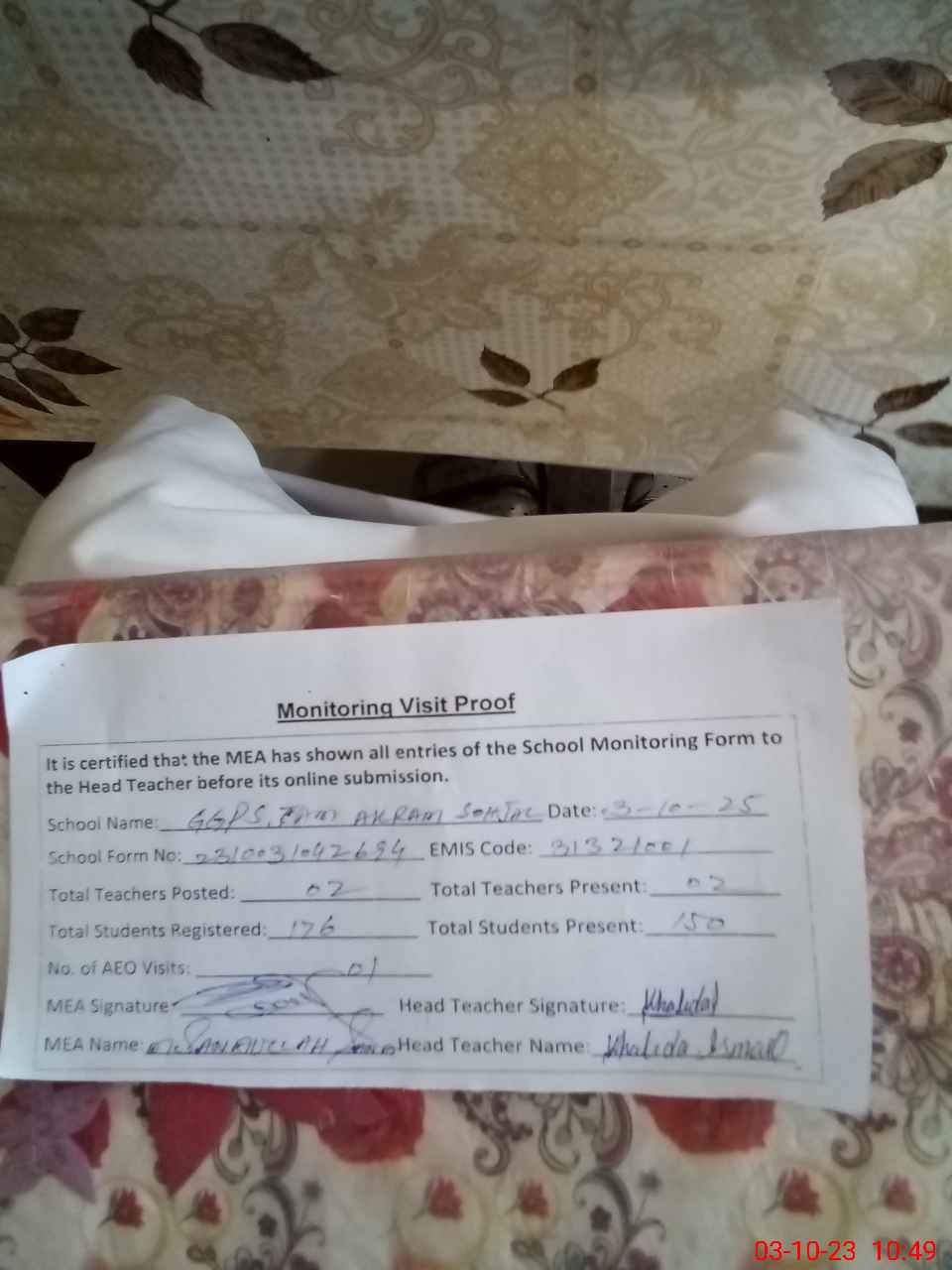 | Attendance Register | Head Teacher | MEA with School | Visit Proof |