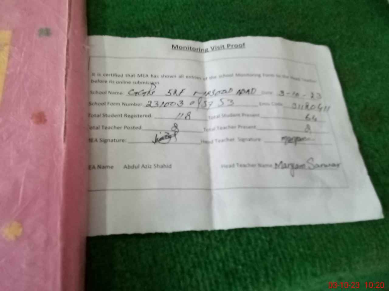| Attendance Register | Head Teacher | MEA with School | Visit Proof |