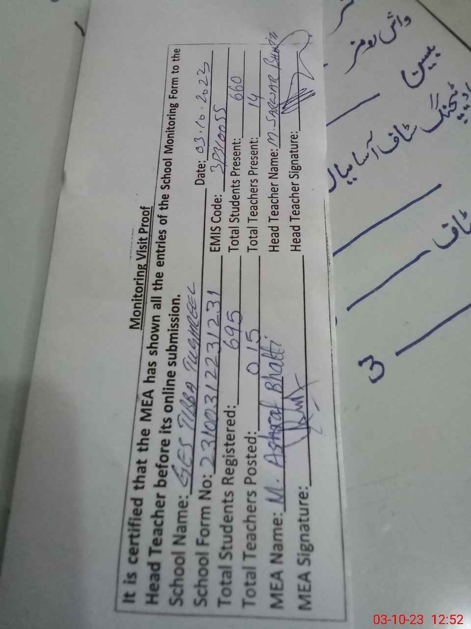 | Certified that this School was Inspected by the Undersigned MEA/DMO Today and the Information Stated Above is as Per Record. | |||||