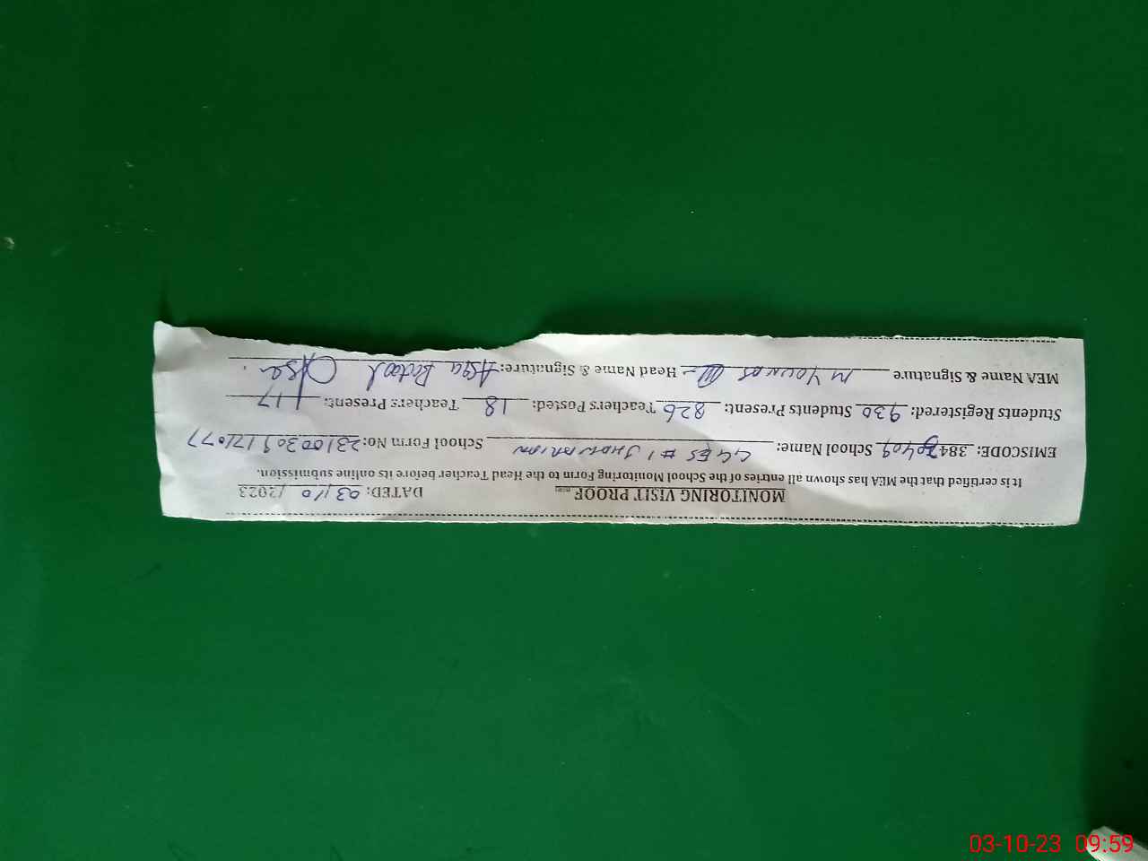 | Monitoring Date: 03-10-2023 | Start Time: 03-10-2023 09:17 AM | End Time: 03-10-2023 09:59 AM | Name of MEA: MU**** YO**** | |