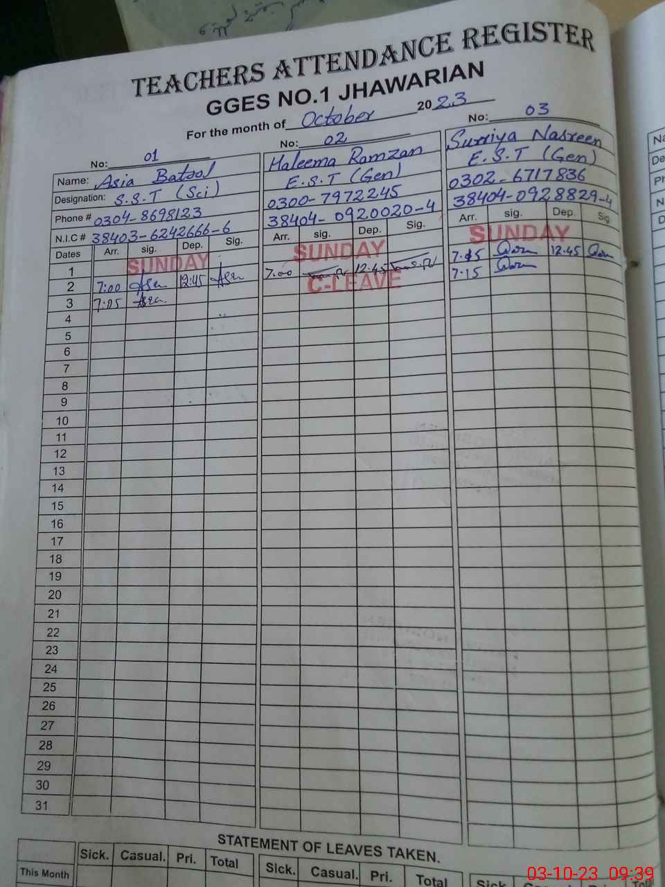 | CNIC | Full Name | Designation | R/C | Absence During Last Calender Month |