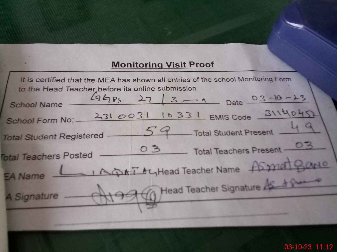 | Attendance Register | Head Teacher | MEA with School | Visit Proof |