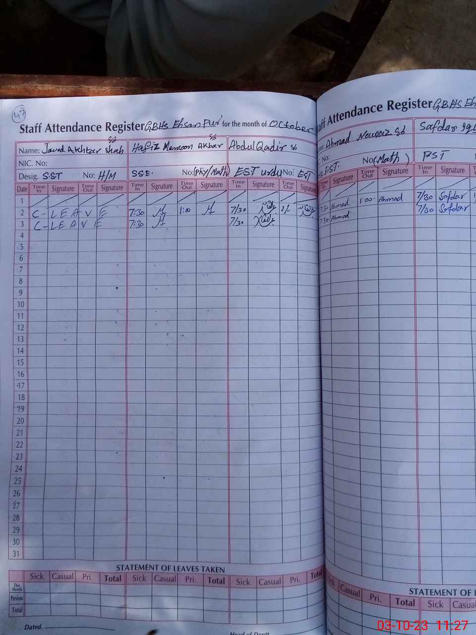 | 31**** | Ha**** Fa**** Ah**** | AT | Temporary | 0 | 27 | 0 | 0 | 0 | 0 | 0 | 0 | 0 | Exam Duty |