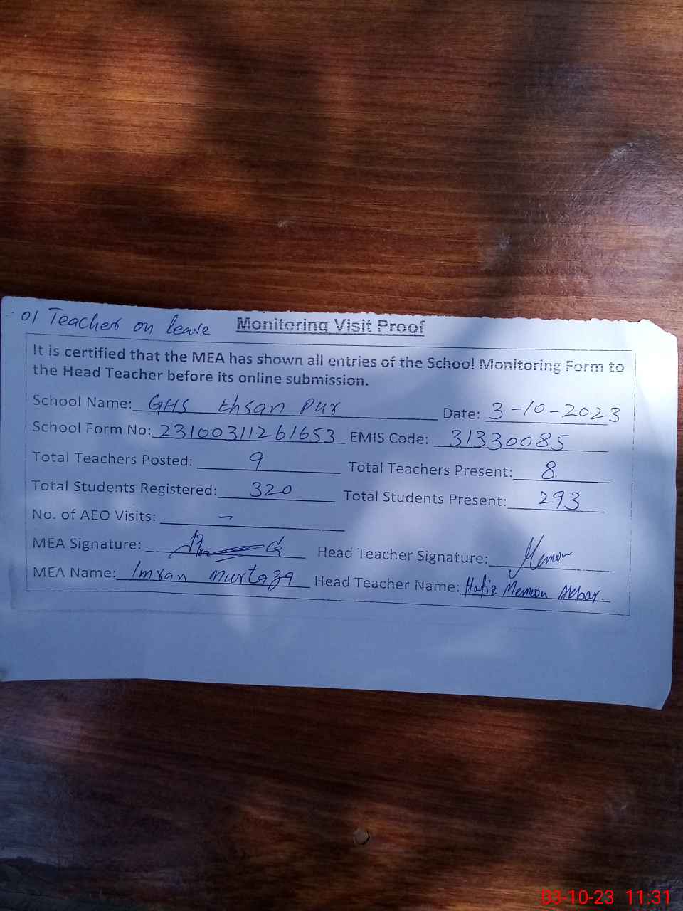 | Attendance Register | Head Teacher | MEA with School | Visit Proof |