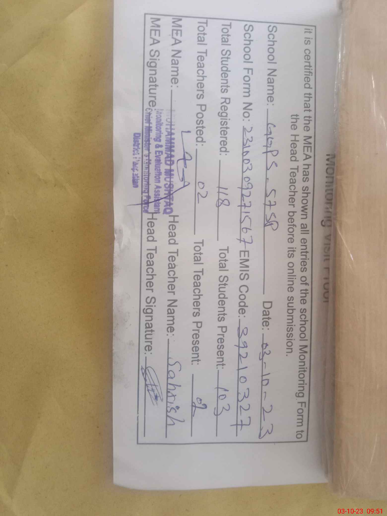 | Attendance Register | Head Teacher | MEA with School | Visit Proof |