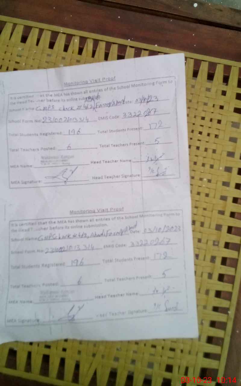 | EMIS Code: 33220267 | Name of School: GMPS CHAK NO. 462 JB ABADI FAROOQUE ABAD | |||