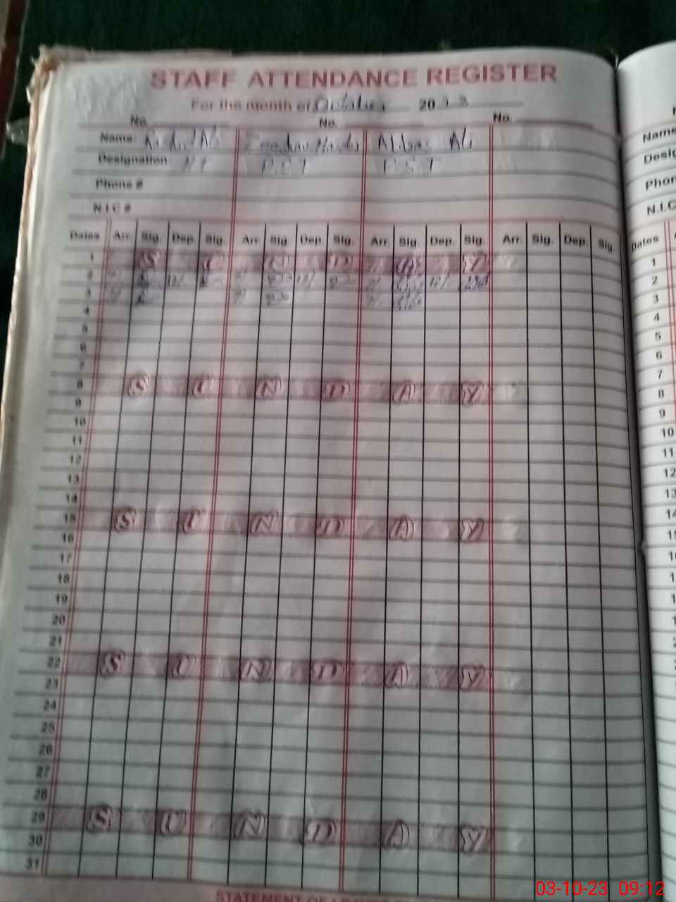 | CNIC | Full Name | Designation | R/C | Absence During Last Calender Month |