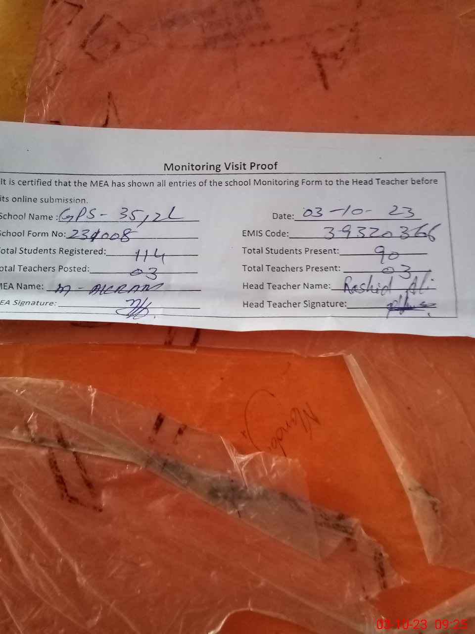 | Attendance Register | Head Teacher | MEA with School | Visit Proof |
