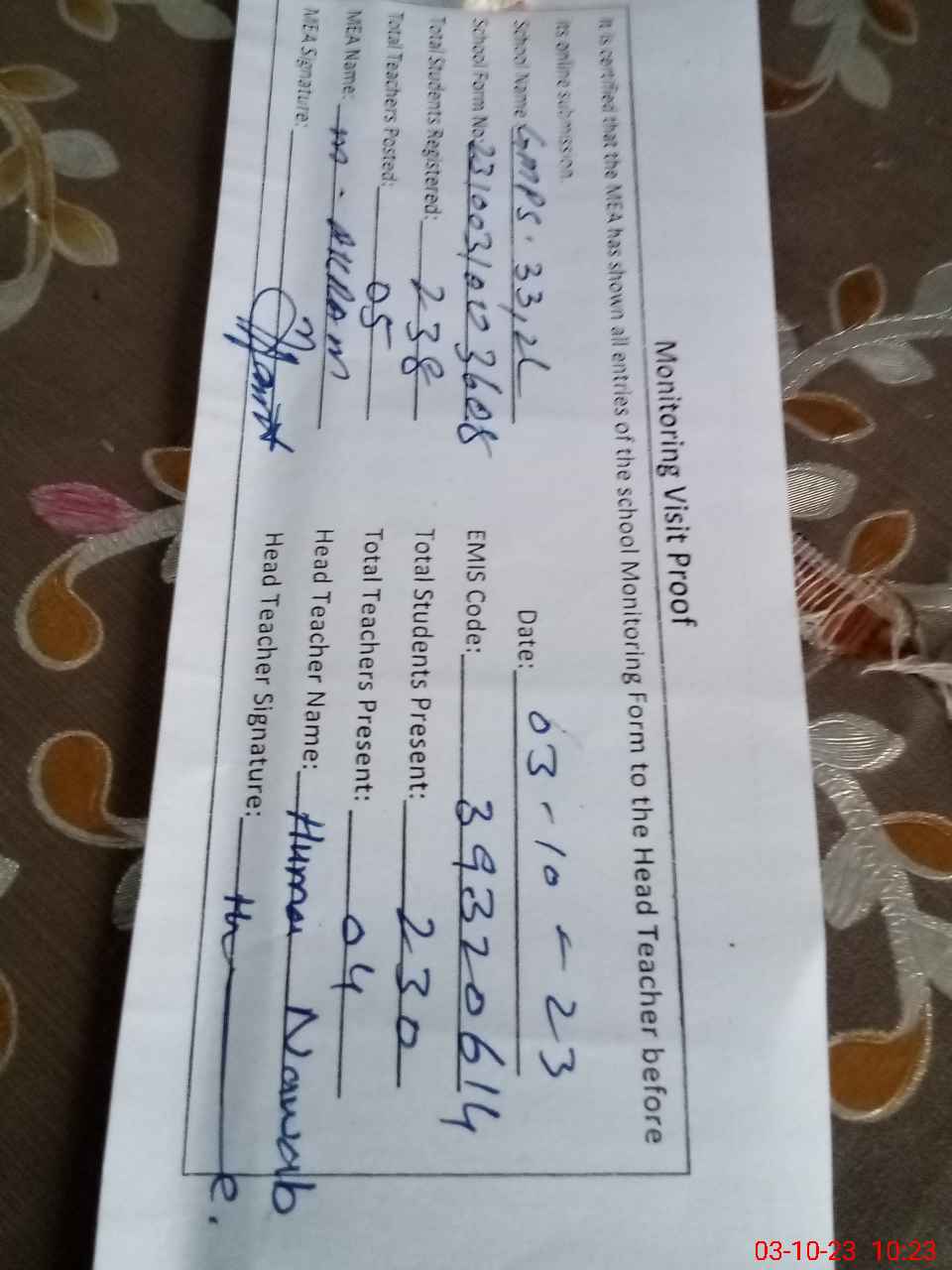 | Attendance Register | Head Teacher | MEA with School | Visit Proof |