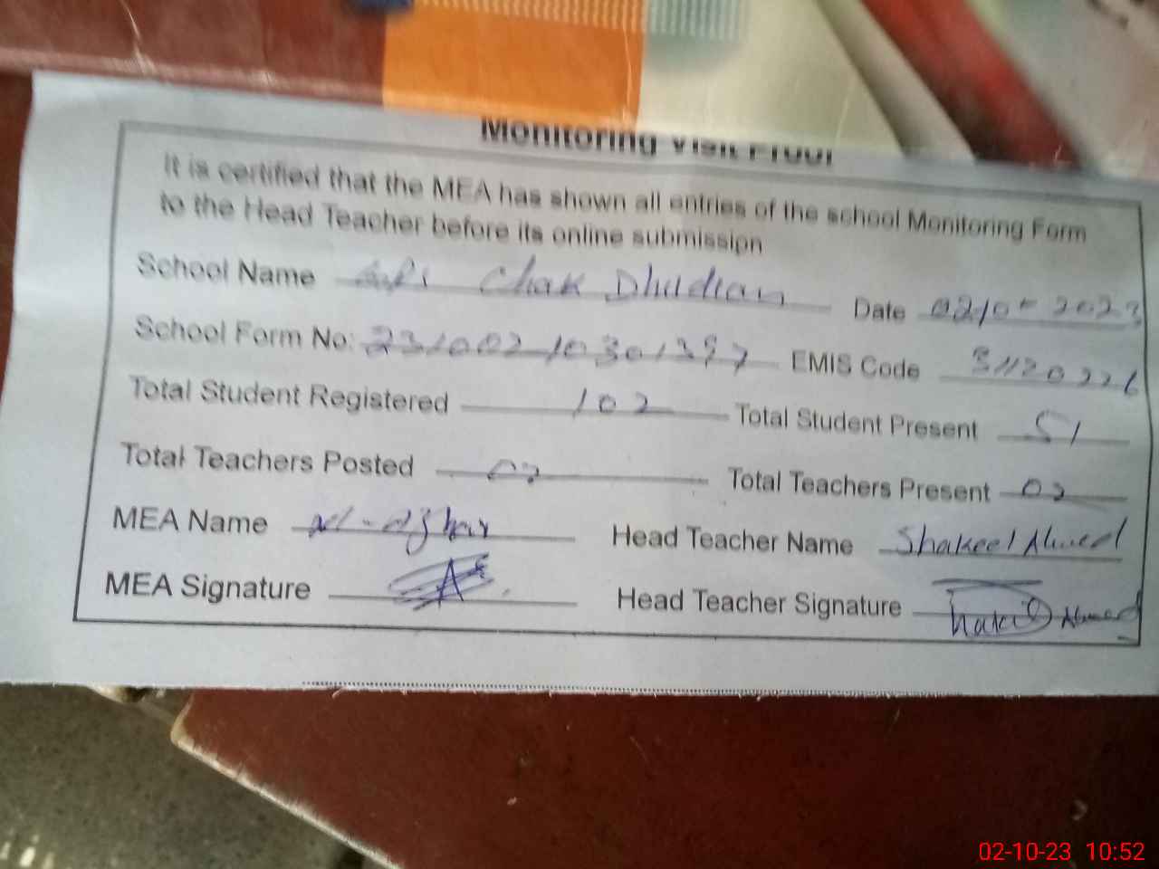 | EMIS Code: 31120226 | Name of School: GPS CHAK DHUDIAN | |||