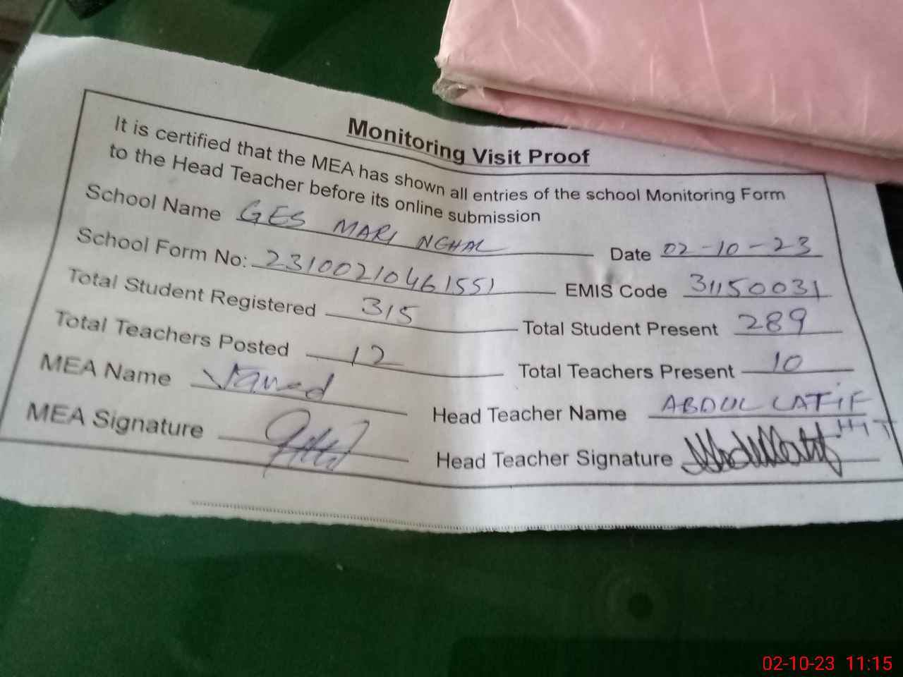 | Attendance Register | Head Teacher | MEA with School | Visit Proof |