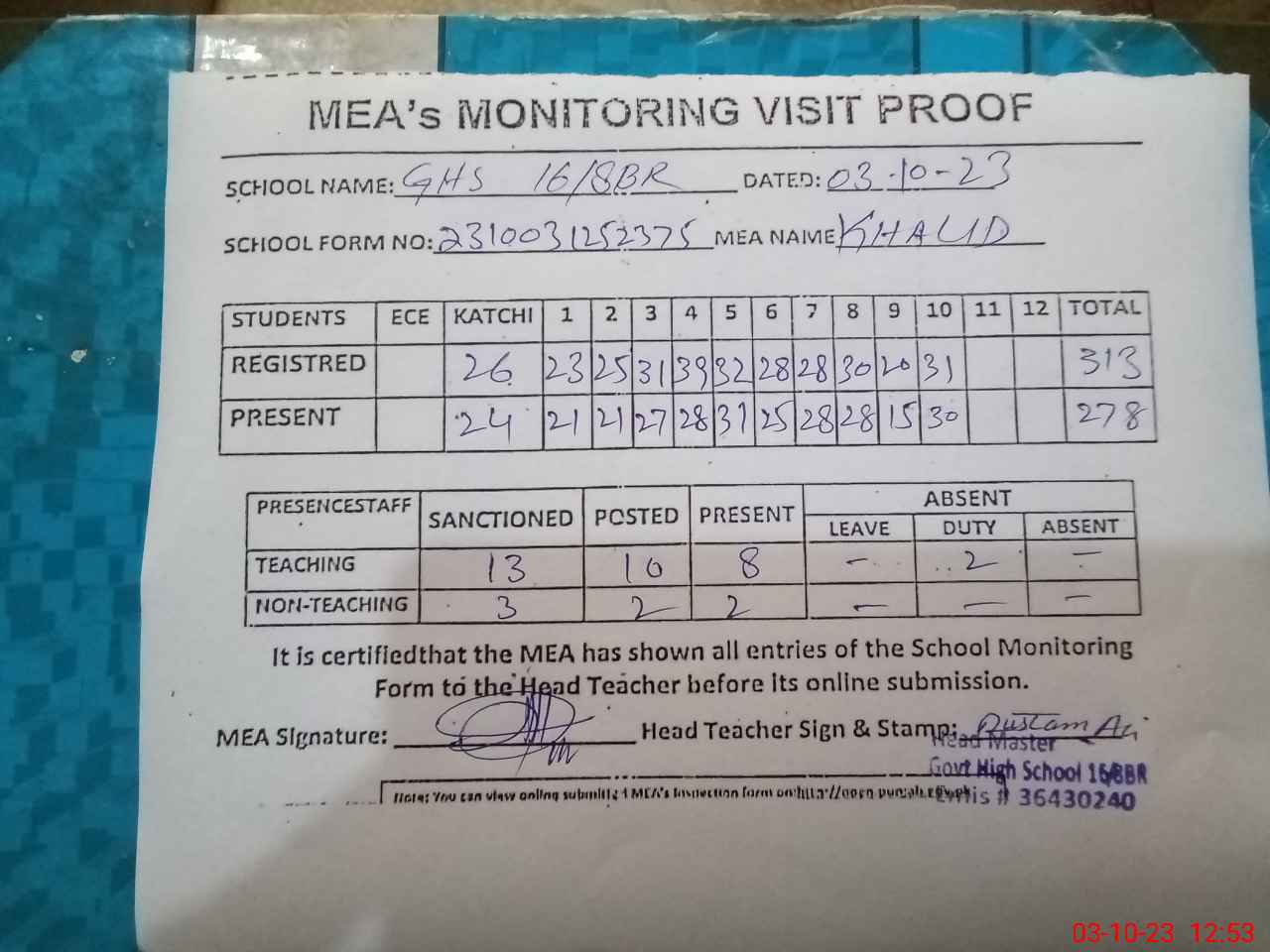 | EMIS Code: 36430240 | Name of School: GHS 16/8-BR, TULAMBA | |||