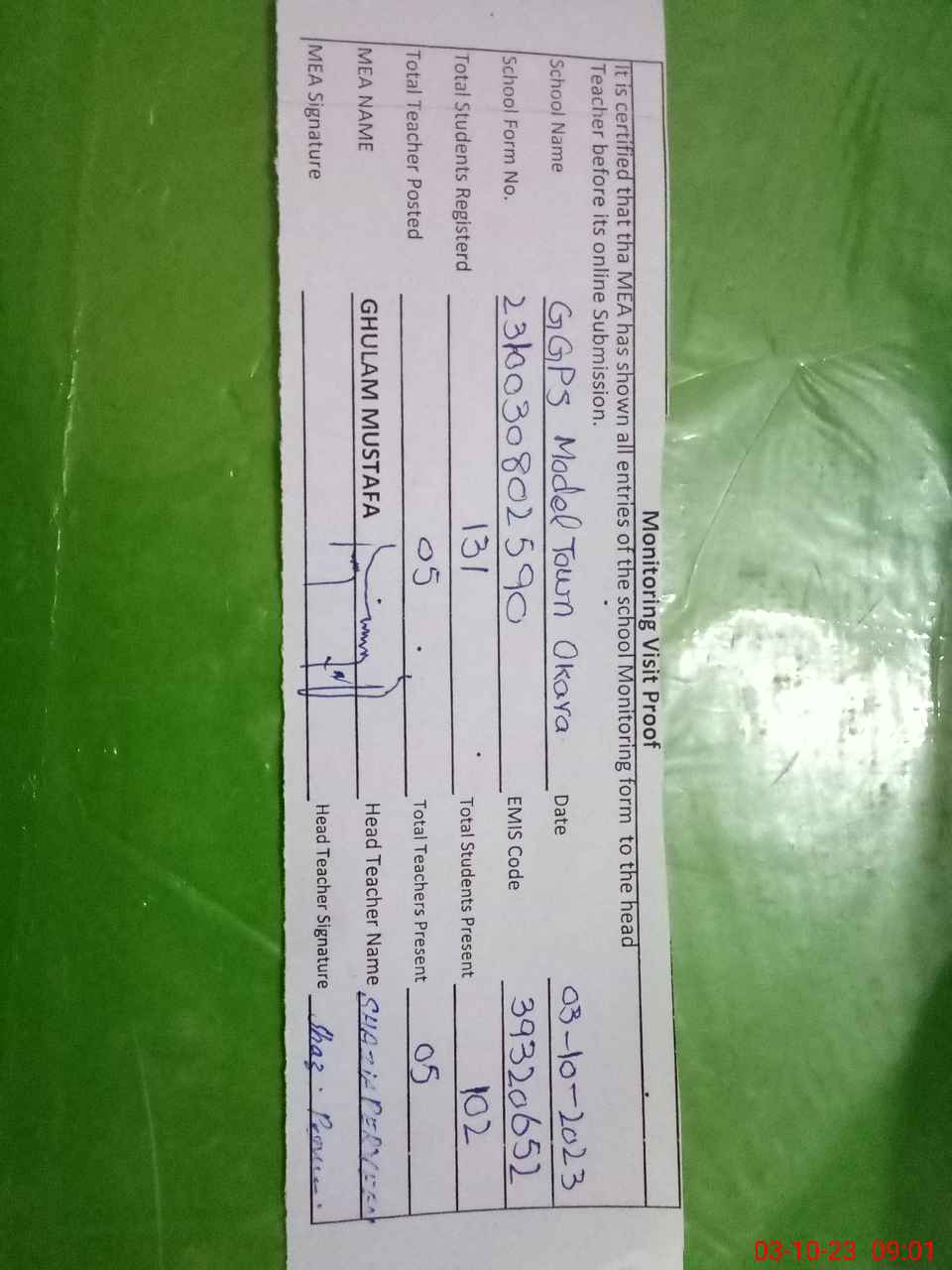 | Attendance Register | Head Teacher | MEA with School | Visit Proof |