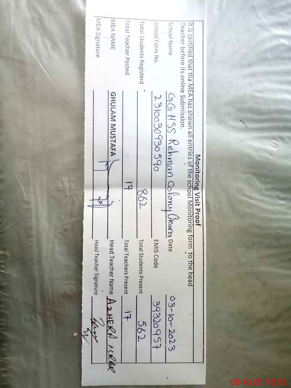 | EMIS Code: 39320957 | Name of School: GGHSS REHMAN COLONY OKARA | |||