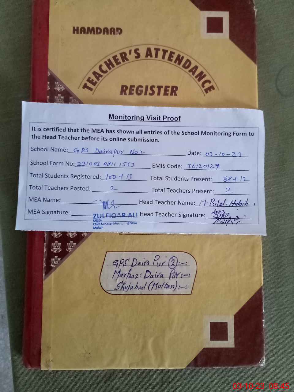 | EMIS Code: 36120129 | Name of School: GPS DAIRA PUR NO. 2 SHUJA ABAD | |||