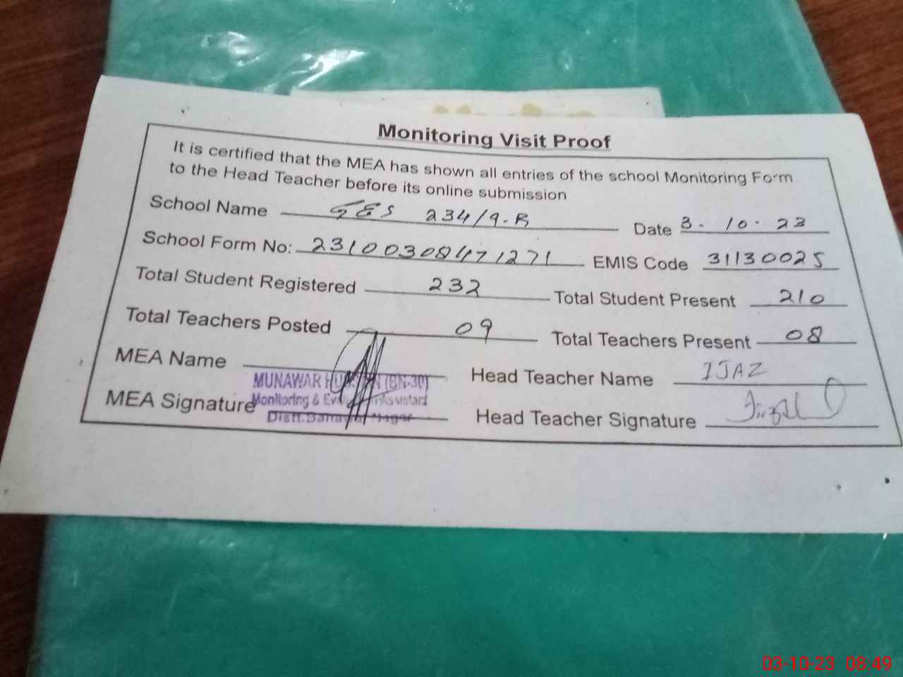 | Attendance Register | Head Teacher | MEA with School | Visit Proof |