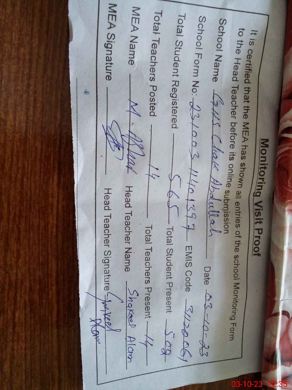 | EMIS Code: 31120061 | Name of School: GHS CHAK ABDULLAH | |||