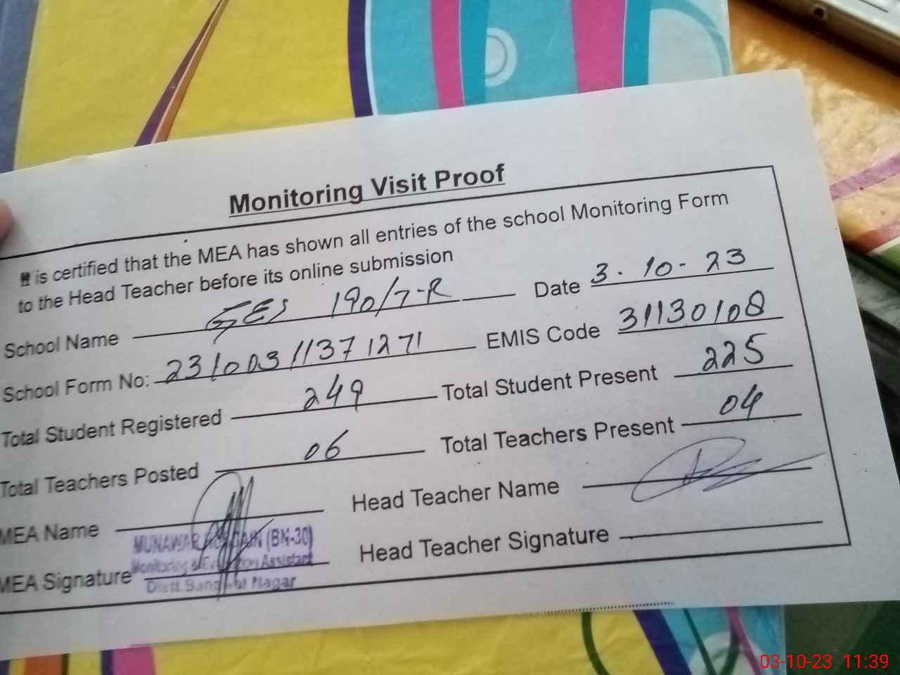 | Attendance Register | Head Teacher | MEA with School | Visit Proof |