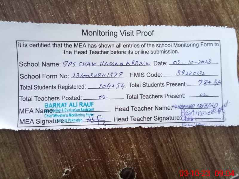 | EMIS Code: 39220132 | Name of School: GPS CHAK HASSAN ARRAIN | |||
