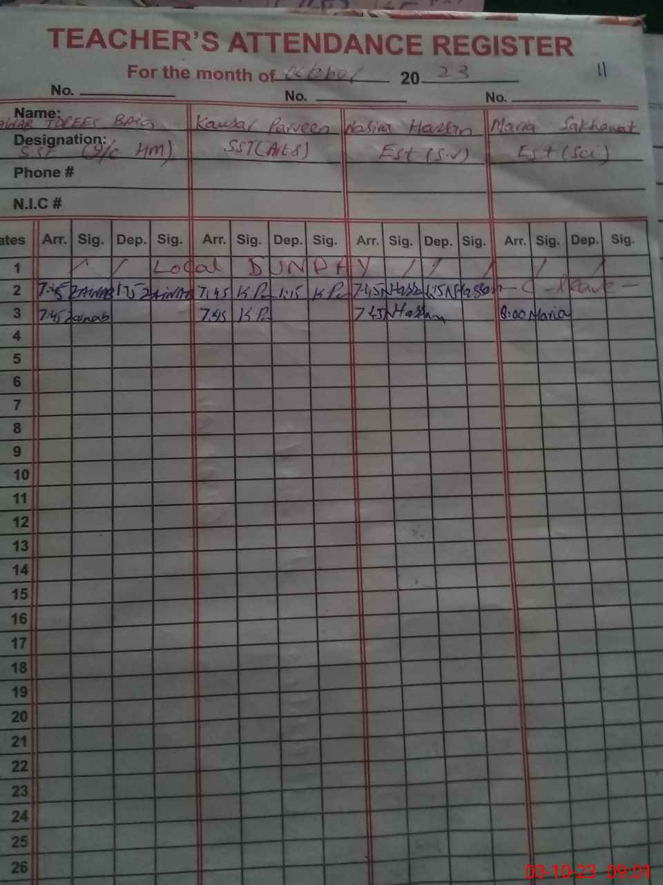 | Name: ZA**** ID**** BA**** Designation: (School Headmaster's/Headmistress's) I/c Head Mistress Phone/Cell Number: 03**** |