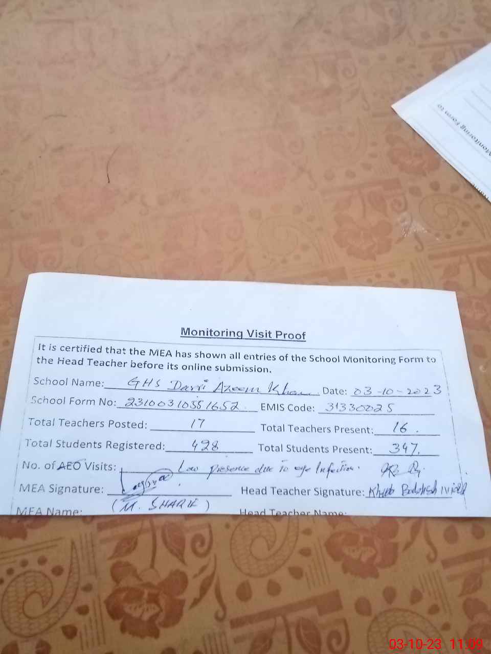 | Attendance Register | Head Teacher | MEA with School | Visit Proof |