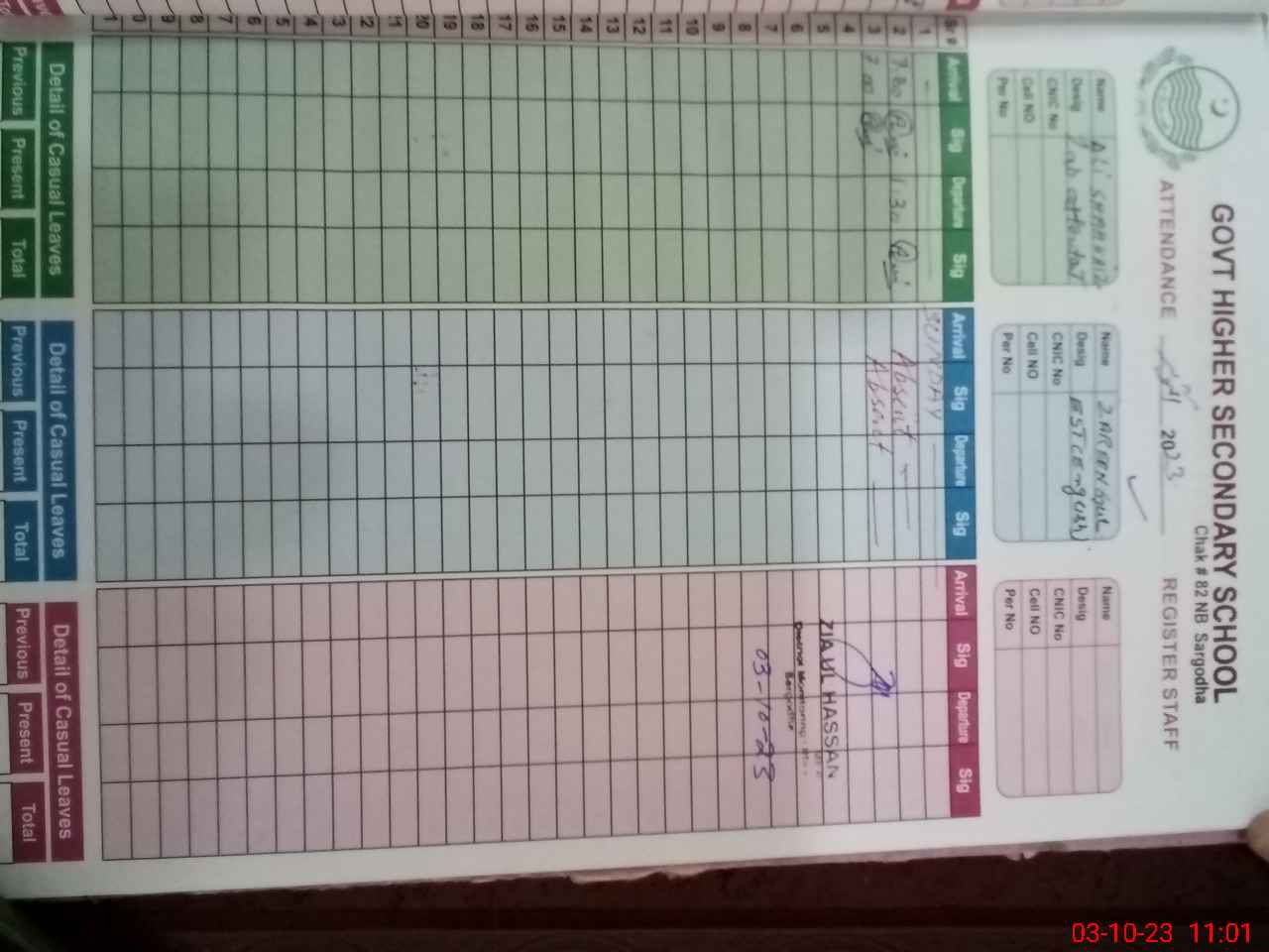 | Remarks (Use Separate Page if Required): TEACHER NAMED ZAREEN GUL EST ENGLISH NIC NUMBER 3840324551398 HAS BEEN ABSENTED SINCE 01 APRIL 2023 TO TILL NOW | |||||