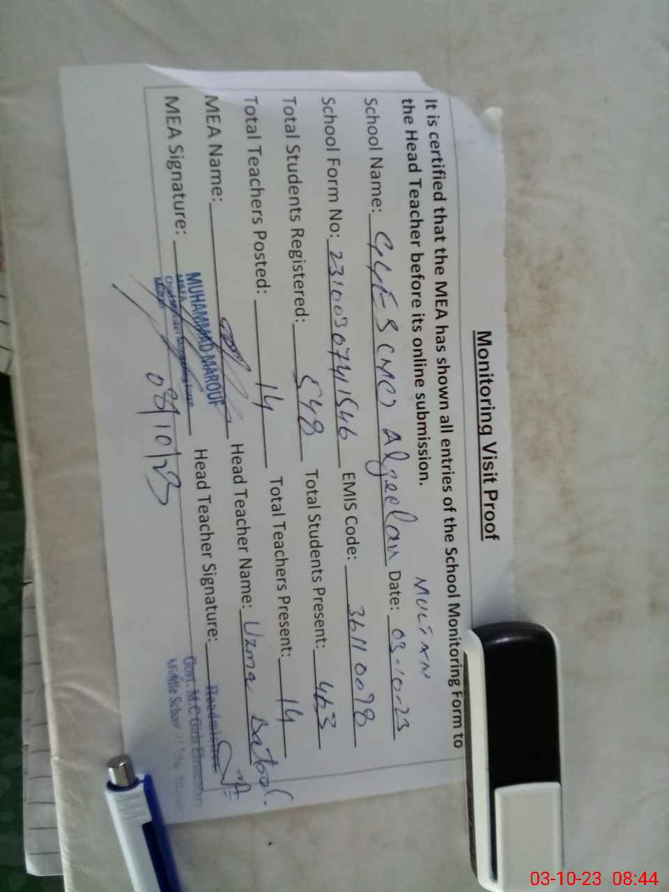 | Attendance Register | Head Teacher | MEA with School | Visit Proof |