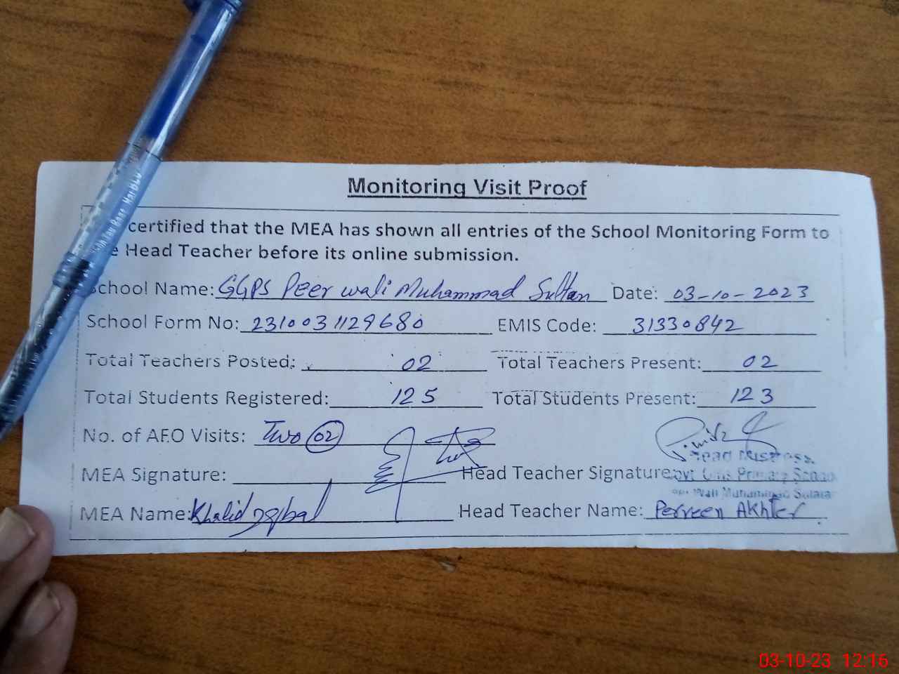 | Attendance Register | Head Teacher | MEA with School | Visit Proof |