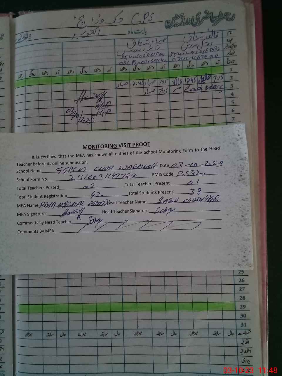 | Attendance Register | Head Teacher | MEA with School | Visit Proof |