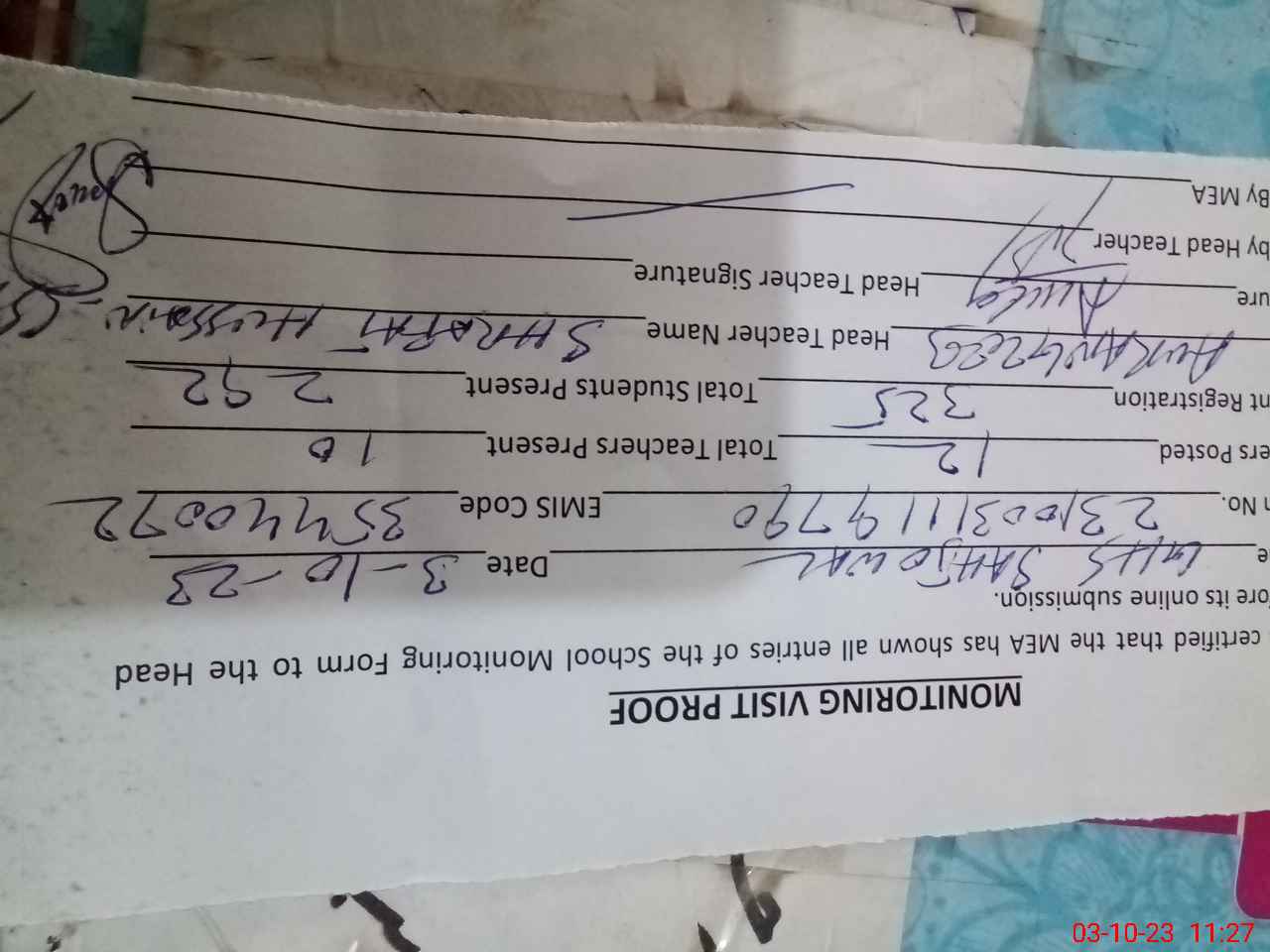 | Name: SH**** HU**** Designation: (School Headmaster's/Headmistress's) SST Phone/Cell Number: 03**** |