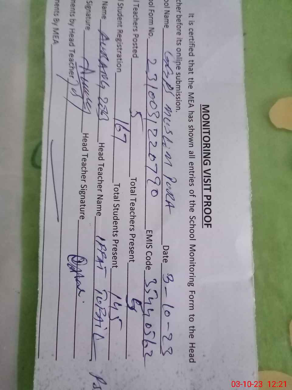 | Attendance Register | Head Teacher | MEA with School | Visit Proof |