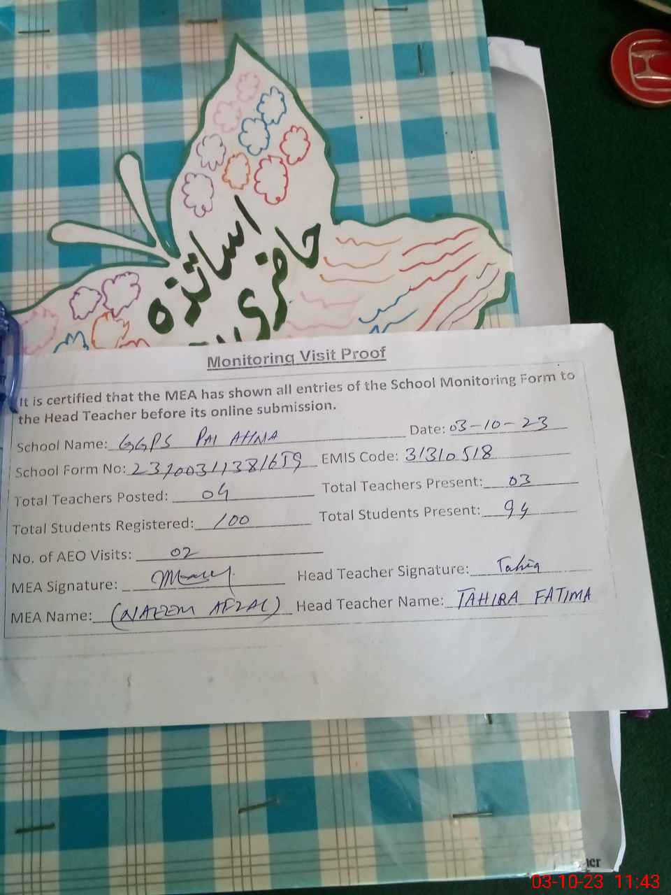 | Attendance Register | Head Teacher | MEA with School | Visit Proof |