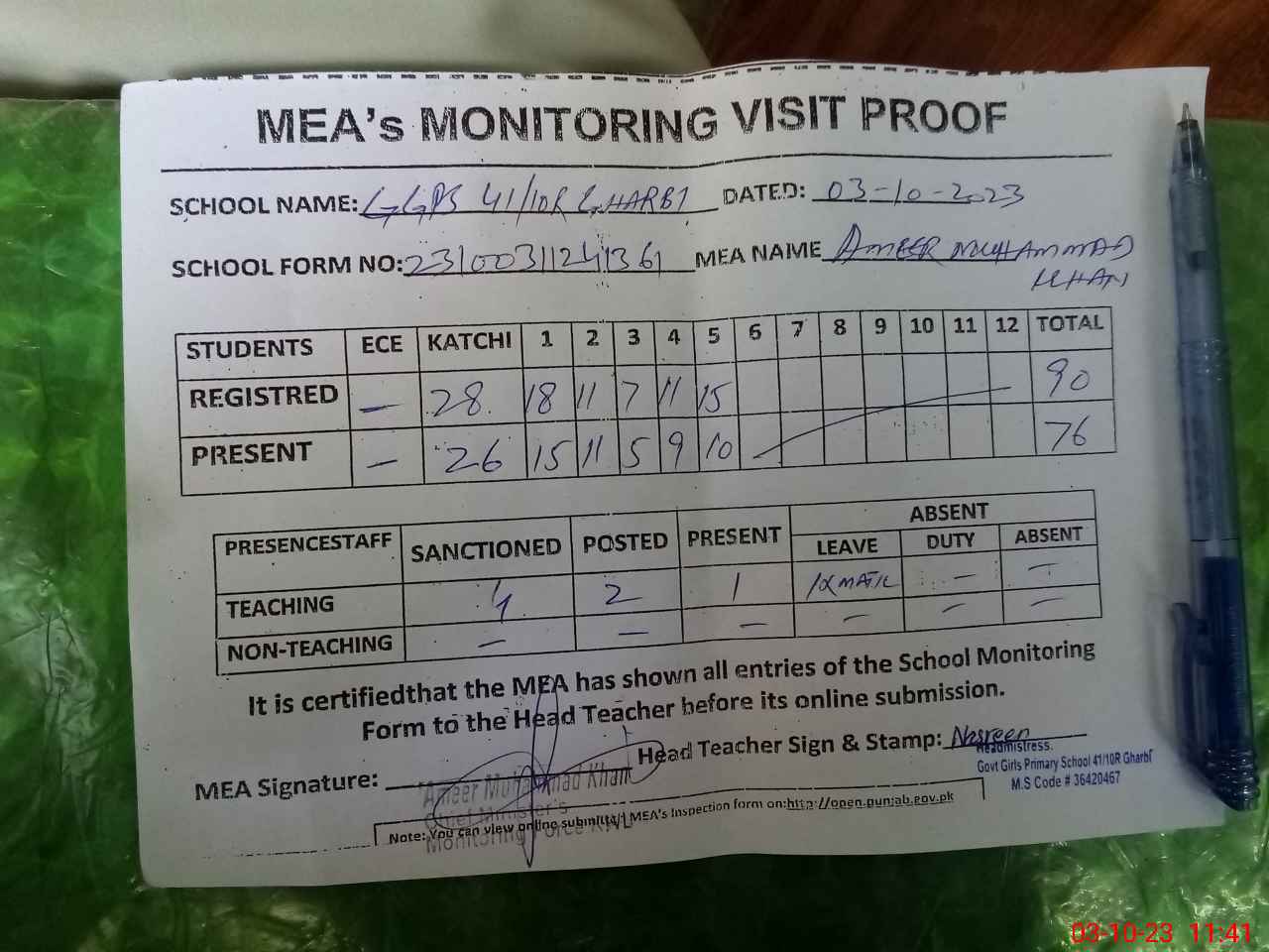 | Attendance Register | Head Teacher | MEA with School | Visit Proof |