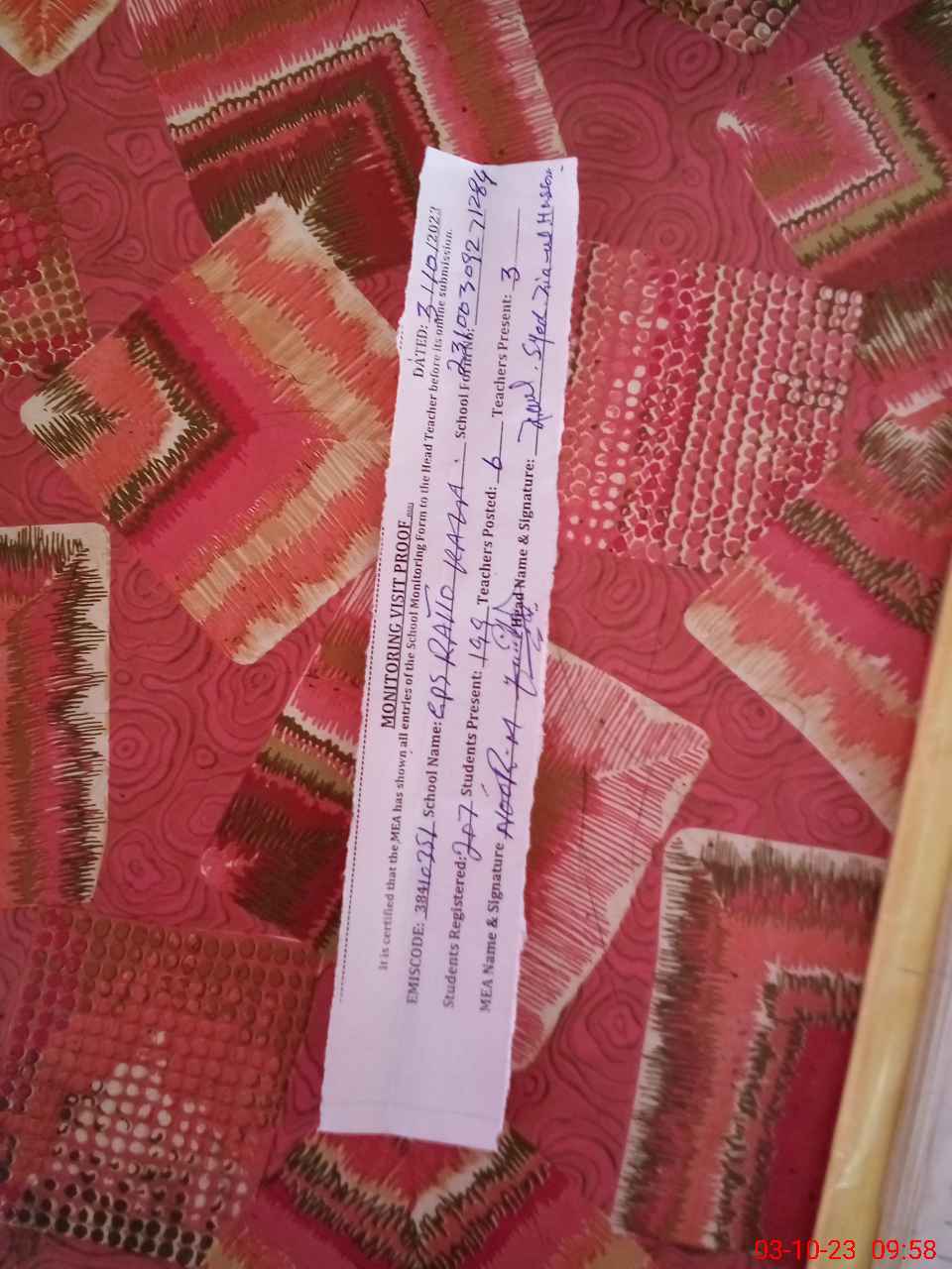 | Attendance Register | Head Teacher | MEA with School | Visit Proof |